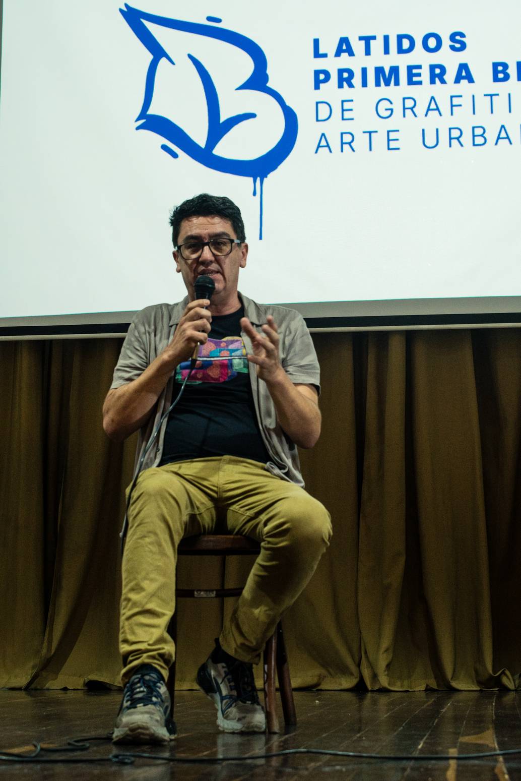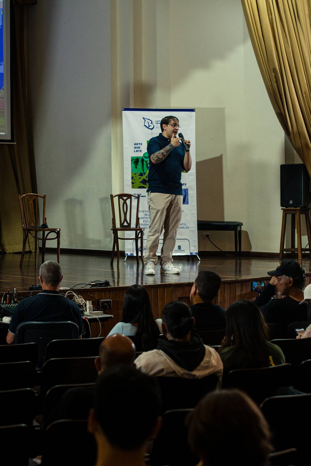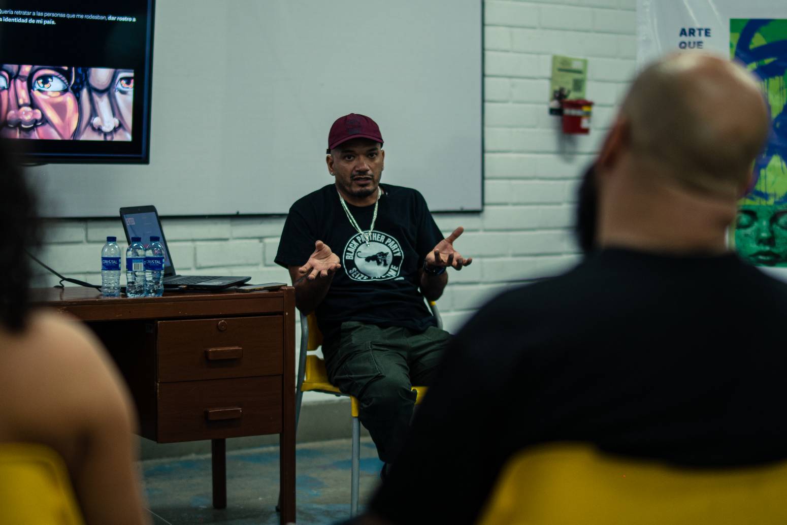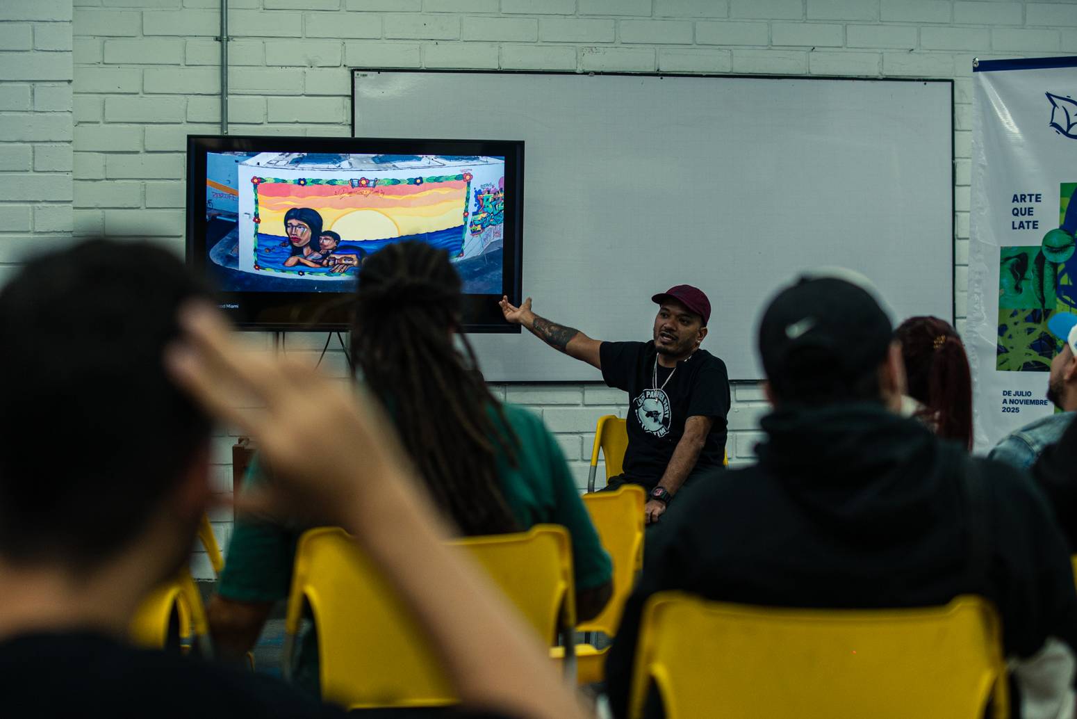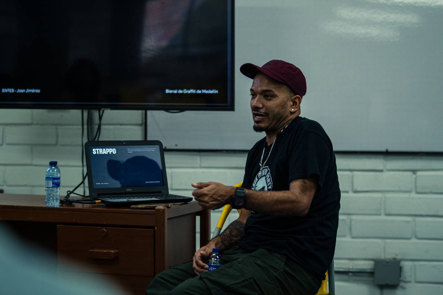El artista visual y muralista peruano Entes compartió su visión del graffiti como resistencia, identidad y memoria, abordando las influencias urbanas, sociales y afroperuanas que atraviesan su obra. En este conversatorio habló sobre su proceso creativo y la manera en que su trabajo dialoga con comunidades marginadas y contextos latinoamericanos. El encuentro se realizó el 26 de septiembre de 2025 en la Fundación Universitaria Bellas Artes, sede Ayacucho, Pasaje Cervantes, salón 201.