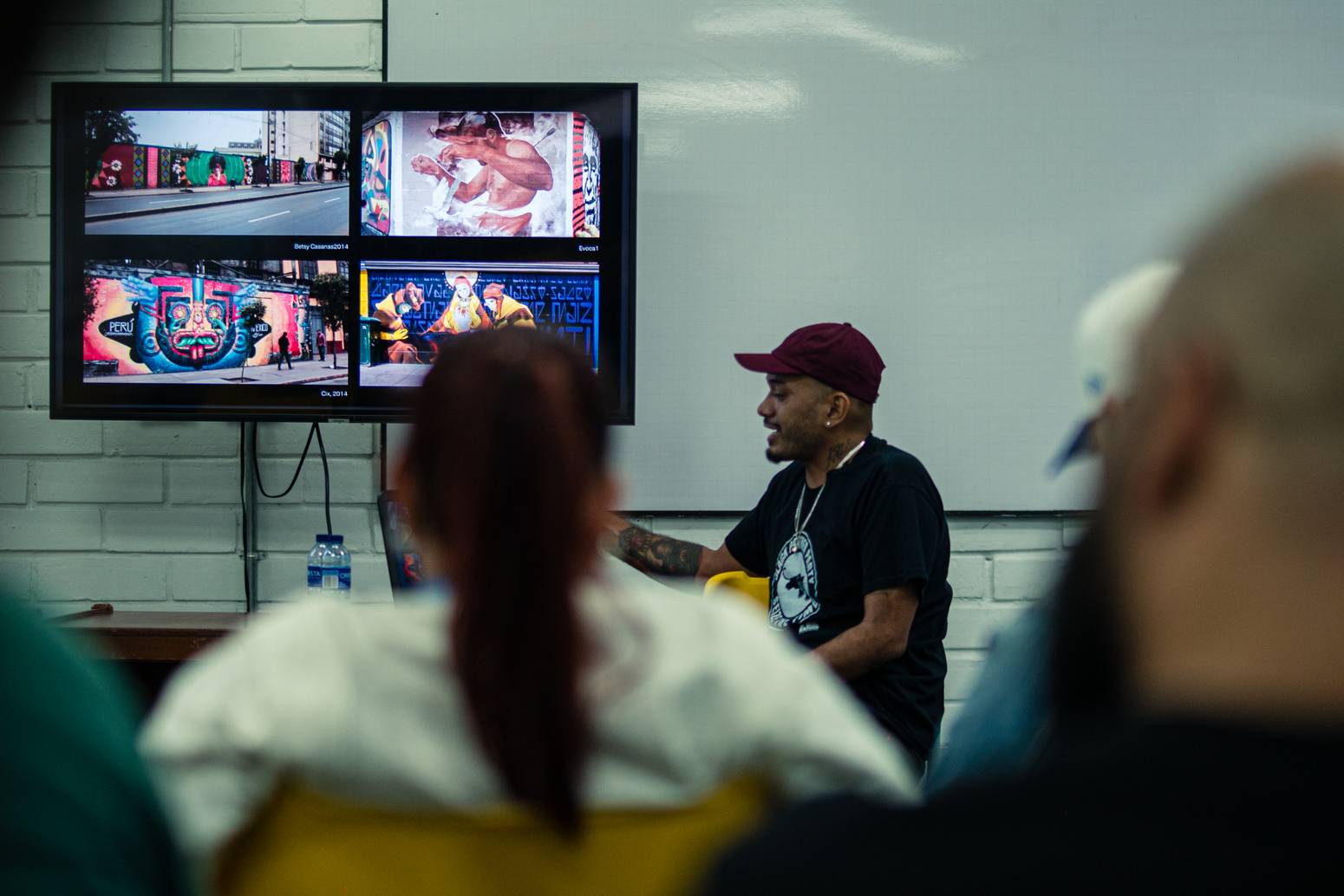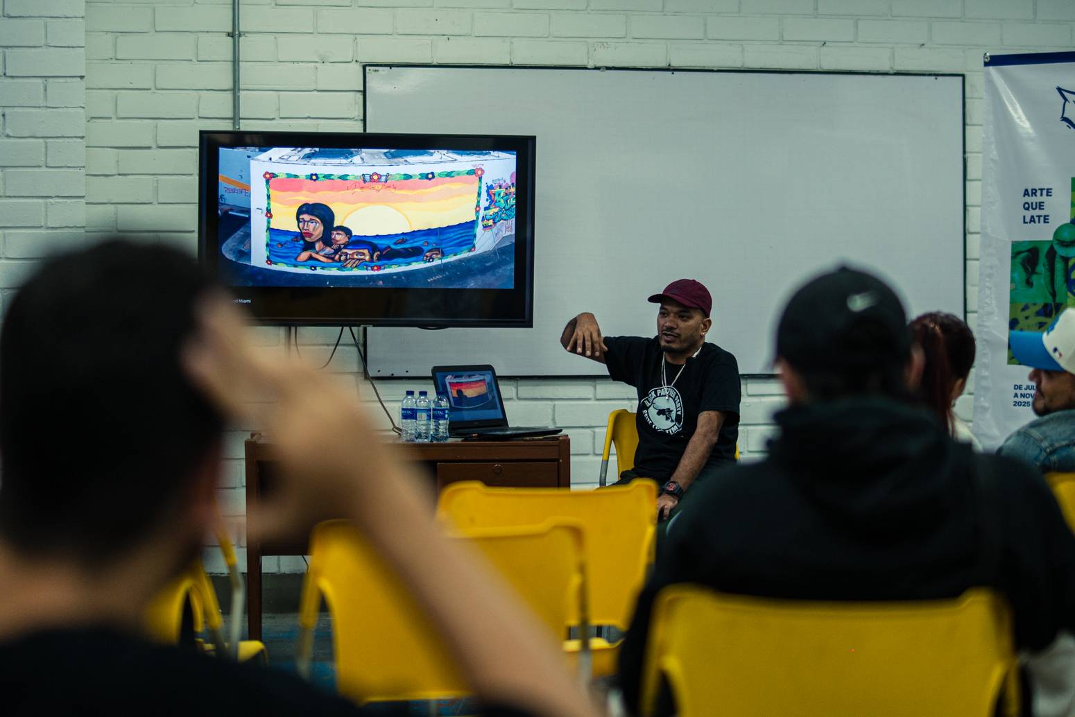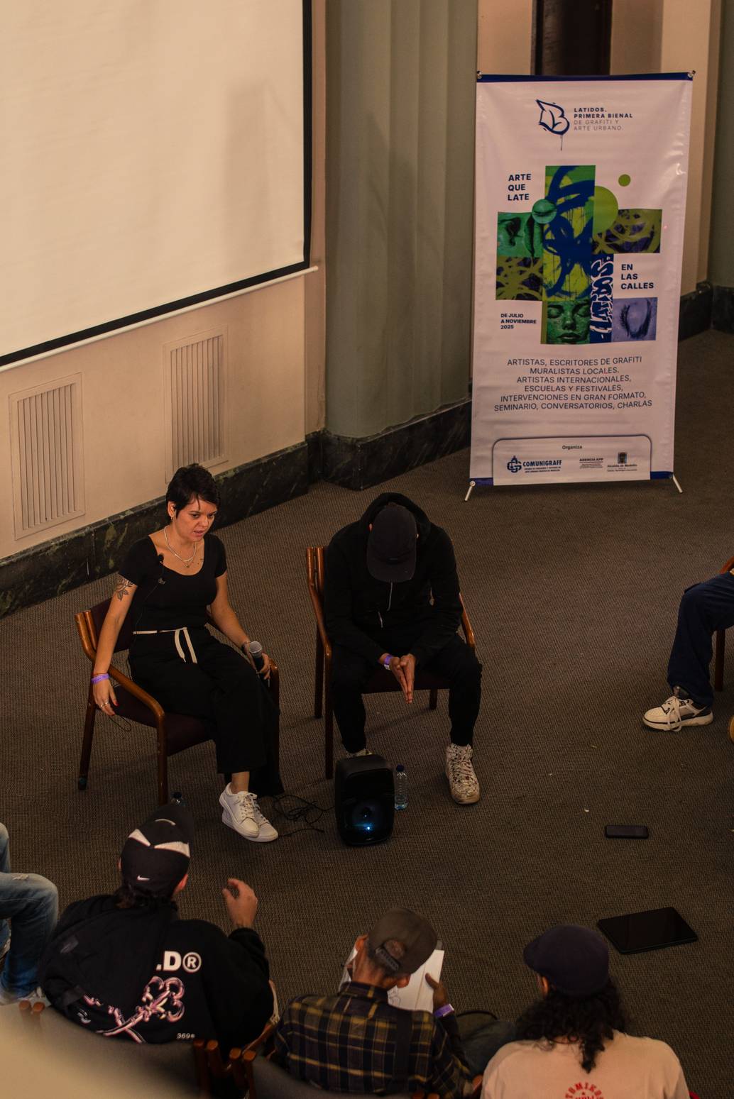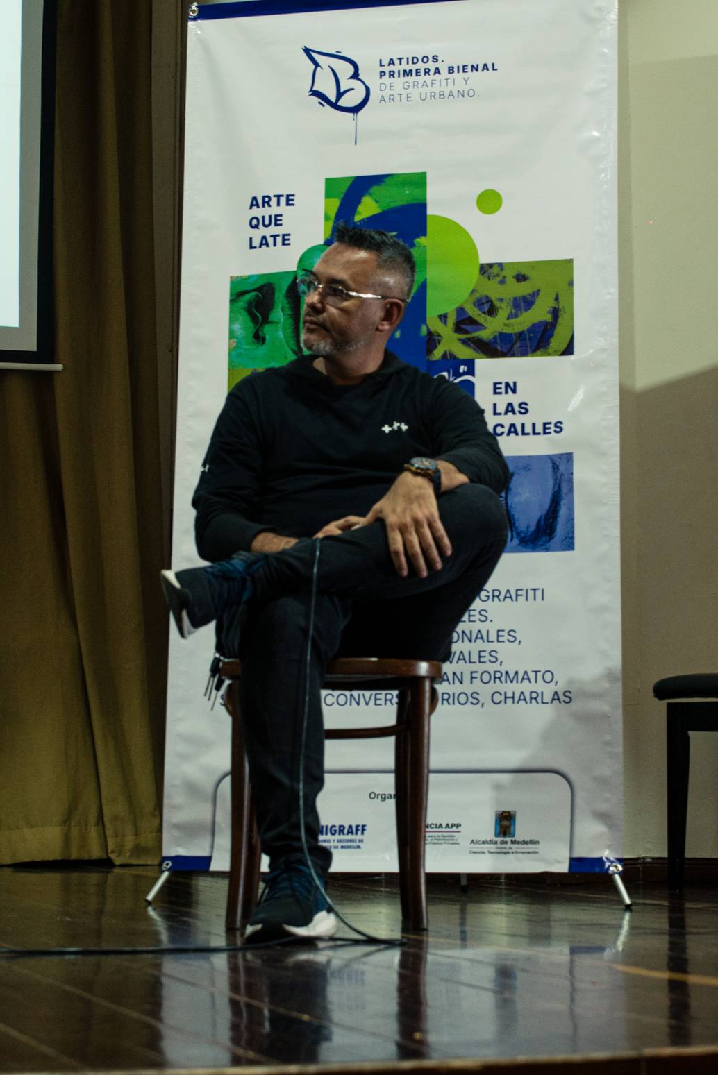 El artista visual y muralista peruano Entes compartió su visión del graffiti como resistencia, identidad y memoria, abordando las influencias urbanas, sociales y afroperuanas que atraviesan su obra. En este conversatorio habló sobre su proceso creativo y la manera en que su trabajo dialoga con comunidades marginadas y contextos latinoamericanos. El encuentro se realizó el 26 de septiembre de 2025 en la Fundación Universitaria Bellas Artes, sede Ayacucho, Pasaje Cervantes, salón 201.